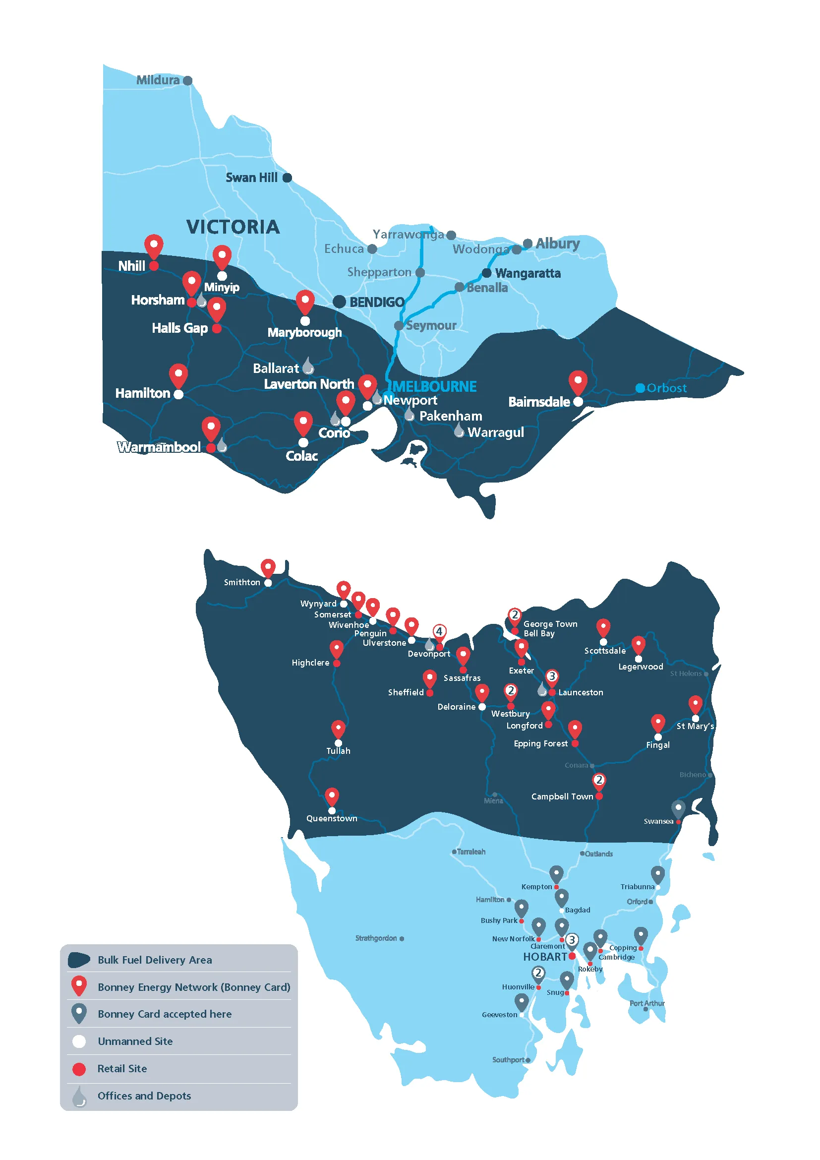 Located across Victoria and Tasmania, each Bonney Energy depot is staffed by people who live and work in the regions they serve. That local knowledge means we understand the industries, conditions and challenges our customers face, and can respond with practical, reliable fuel and lubricant solutions that keep businesses moving.