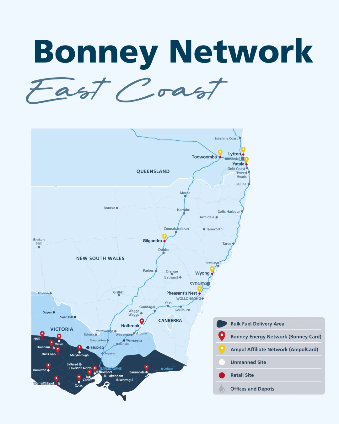 In Victoria, there are fewer Bonney Card sites, but that doesn’t mean less coverage. By pairing your Bonney Card with an AmpolCard, you gain access to the entire Ampol network across Victoria and Australia.