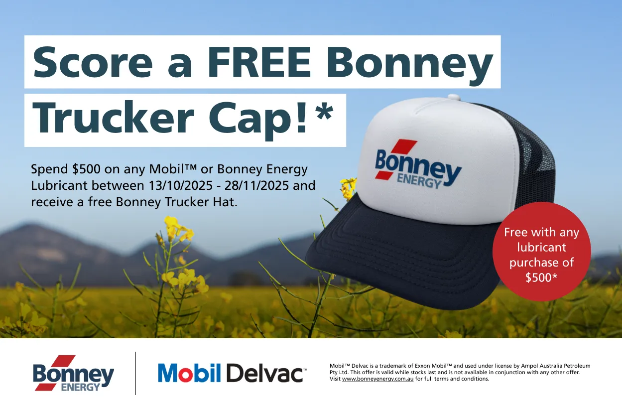 From 13 October to 28 November 2025, when you spend $500 or more on any Mobil™ or Bonney Energy Lubricant product, you’ll receive a free Bonney Trucker Hat - our way of saying thanks for choosing Bonney.
